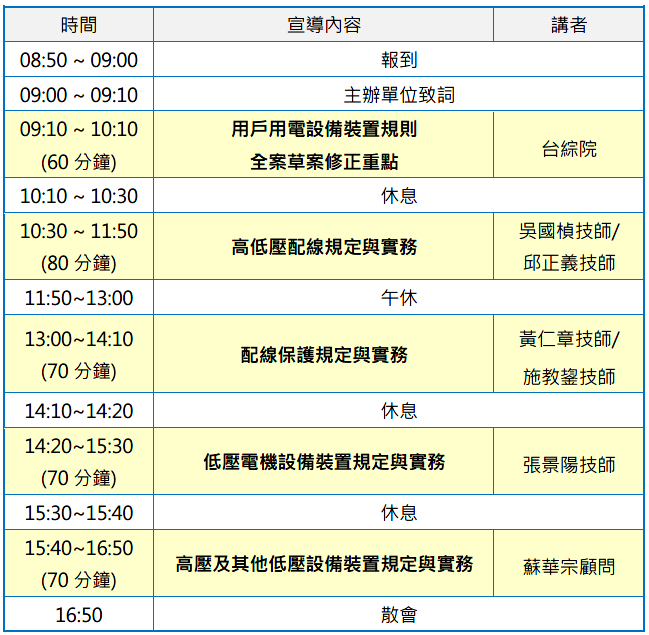 今年宣導說明會規劃以兩大主題進行巡迴說明,包含一般高低壓配線外,特別著重於特殊場所設施之法規與實務。特殊場所設施主題已安排於8月下旬舉辦,本次巡迴說明一般高低壓配線法規修正與實務設計施作,並於台北、新竹、彰化、嘉義、高雄及花蓮各舉辦1場,儘量讓全台各區域之業者便於參加。敬邀各界電氣相關技術人員踴躍參加。